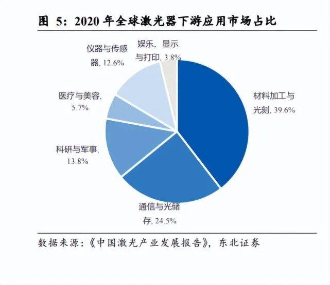 在激光技術(shù)發(fā)展初期,由于激光器功率普遍較低,激光主要被用于通信領(lǐng)域和光儲(chǔ) 存領(lǐng)域,Laser Focus World 數(shù)據(jù)顯示,2009 年激光器在通信和光儲(chǔ)存領(lǐng)域的應(yīng)用占 比達(dá)到 55.2%,而材料加工僅占 25.7%。隨著高功率激光器技術(shù)的不斷突破,激光 越來(lái)越多地被運(yùn)用到材料加工領(lǐng)域,2020 年,激光的下游應(yīng)用中材料加工與光刻占 比達(dá)到 39.6%,其中光刻實(shí)質(zhì)上屬于材料加工的一種形式。2016 年以來(lái)激光在材料 加工領(lǐng)域的應(yīng)用始終占有著 40%左右的比例,顯示出材料加工已取代通信與光儲(chǔ)存 成為激光最重要的應(yīng)用領(lǐng)域。