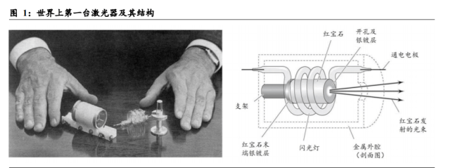 1917 年,愛因斯坦從理論上指出,當(dāng)光與物質(zhì)相互作用時(shí),除了吸收和自發(fā)輻射之 外,還存在第三種過(guò)程——受激輻射,不過(guò)愛因斯坦并沒(méi)有想到利用受激輻射來(lái)實(shí) 現(xiàn)光的放大,因此在愛因斯坦提出受激輻射理論后的許多年內(nèi),這個(gè)理論并沒(méi)有太 多運(yùn)用。1954 年,基于受激輻射理論,美國(guó)科學(xué)家湯斯發(fā)明了微波激射器(Microwave Amplification by Stimulated Emission of Radiation,MASER),MASER 可以產(chǎn)生放大 的微波束,但一方面由于 MASER 產(chǎn)生的微波束不夠穩(wěn)定,另一方面受限于微波自 身的性質(zhì),使得 MASER 至今僅在天文領(lǐng)域得到少量應(yīng)用。1960 年,美國(guó)科學(xué)家梅 曼利用一個(gè)高強(qiáng)的螺旋形閃光燈管作為泵浦源,紅寶石作為增益介質(zhì),并通過(guò)在紅 寶石兩側(cè)鍍銀及一側(cè)開孔,使其內(nèi)部產(chǎn)生諧振腔,首次制成了光波激射器((Light Amplification by Stimulated Emission of Radiation,LASER)),LASER 能夠發(fā)出受激 輻射放大的光波,這種光波后被我國(guó)科學(xué)家錢學(xué)森譯為激光。泵浦源+增益介質(zhì)+諧 振腔至今仍是激光器的核心構(gòu)成。紅寶石激光器的發(fā)明,標(biāo)志著激光時(shí)代的到來(lái)。此后數(shù)年間,科學(xué)家又嘗試用不同的增益介質(zhì)研制出了各類不同的激光器,激光開 始登上歷史舞臺(tái)。