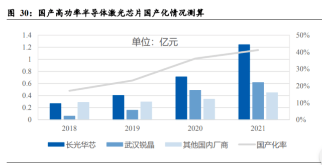 由于國(guó)內(nèi)較多激光元器件及激光器廠商已掌握半導(dǎo)體激光泵浦源封裝技術(shù),因此高 功率激光芯片的國(guó)產(chǎn)化是產(chǎn)業(yè)鏈上游實(shí)現(xiàn)自主可控最為關(guān)鍵的環(huán)節(jié)。對(duì)工業(yè)用高功 率半導(dǎo)體激光芯片整體的國(guó)產(chǎn)化情況進(jìn)行測(cè)算,國(guó)內(nèi)有能力自主生產(chǎn)工業(yè)用高功率 半導(dǎo)體激光芯片的公司主要有長(zhǎng)光華芯、武漢銳晶,華光光電、瑞波光電和度亙激 光等。長(zhǎng)光華芯在其招股說(shuō)明書中披露 2020 年高功率半導(dǎo)體激光芯片收入約 0.71 億元,約占當(dāng)年總收入的 29%,假設(shè)長(zhǎng)光華芯高功率半導(dǎo)體激光芯片收入占比保持 穩(wěn)定;武漢銳晶與銳科激光的控股股東相同,其生產(chǎn)的激光芯片幾乎均供給銳科并 由銳科進(jìn)行封裝,假設(shè)銳晶的高功率半導(dǎo)體激光芯片收入與銳科披露的關(guān)聯(lián)方交易 金額一致。由于長(zhǎng)光華芯和武漢銳晶的快速崛起,我國(guó)的高功率半導(dǎo)體激光芯片國(guó) 產(chǎn)化率提升顯著。若假設(shè)華光光電、瑞波光電和度亙激光等其余企業(yè)在高功率半導(dǎo) 體激光芯片上的市占率為 5-10%,則 2021 年我國(guó)的高功率半導(dǎo)體激光芯片國(guó)產(chǎn)化 率達(dá)到 40%左右。長(zhǎng)光華芯于 2022 年上市,募資的一部分用于高功率半導(dǎo)體激光 芯片的擴(kuò)產(chǎn),度亙激光也于 2022 年完成 PreIPO 融資并進(jìn)行了大規(guī)模擴(kuò)產(chǎn)。我們認(rèn) 為今后工業(yè)高功率半導(dǎo)體激光芯片的國(guó)產(chǎn)化率還將進(jìn)一步提升,在該關(guān)鍵環(huán)節(jié)實(shí)現(xiàn) 自主可控。