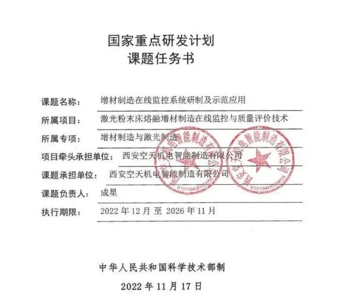 近期,2022年國家重點研發(fā)計劃項目評審結(jié)果公布,由西安空天機(jī)電智能制造有限公司(以下簡稱“西空智造”)牽頭申報的國家重點研發(fā)計劃“增材制造與激光制造”重點專項“激光粉末床熔融增材制造在線監(jiān)控與質(zhì)量評價技術(shù)”項目獲批立項。