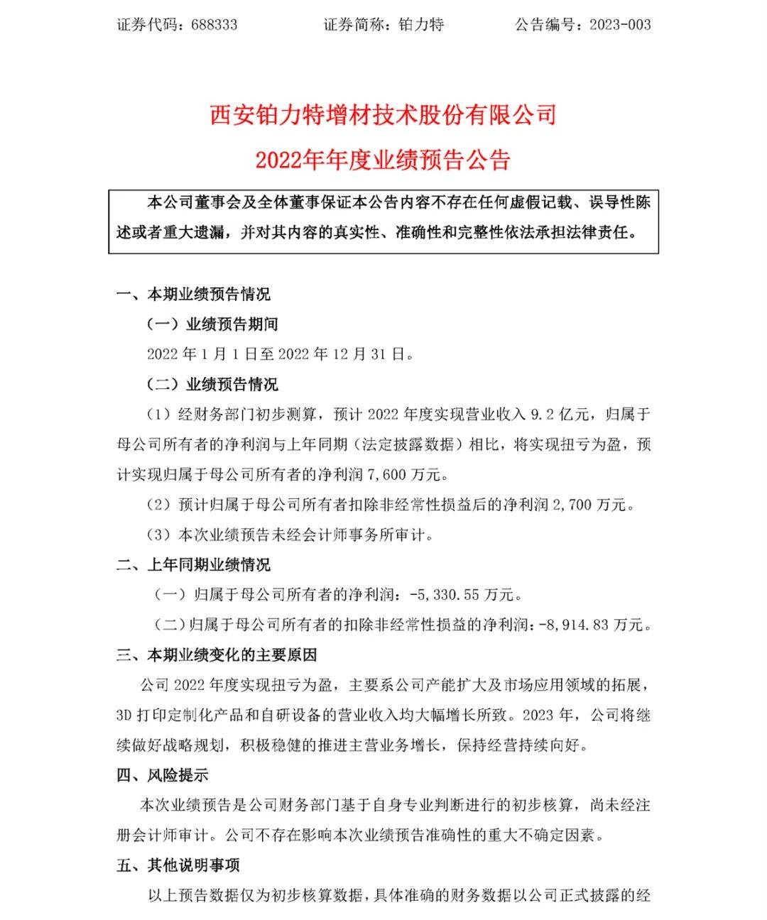 主營金屬3D打印收入9.2億元,勁增66%,鉑力特發(fā)布2022年業(yè)績預告