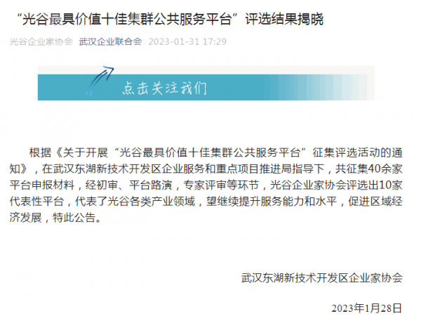 1月31日,武漢東湖新技術(shù)開發(fā)區(qū)企業(yè)家協(xié)會(huì)公布“光谷最具價(jià)值十佳集聚公共服務(wù)平臺(tái)”,武漢·中國光谷激光行業(yè)協(xié)會(huì)成功入選。 武漢東湖新技術(shù)開發(fā)區(qū)企業(yè)家協(xié)會(huì)為了推動(dòng)...