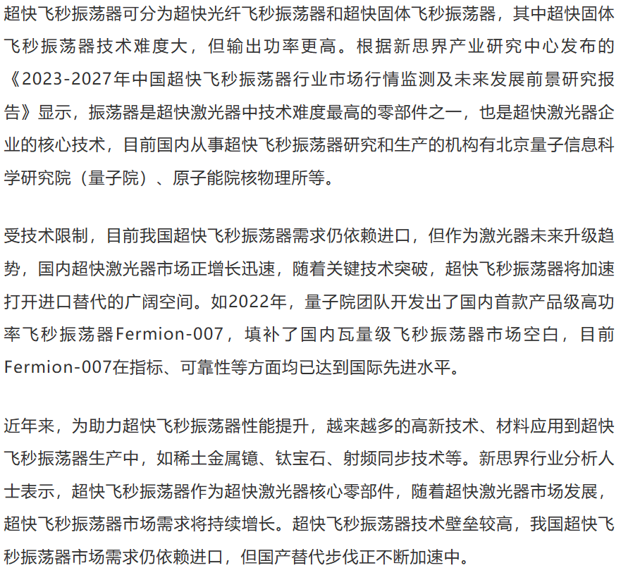 振蕩器是一種基礎(chǔ)電子元器件,主要功能是提供電路頻率,廣泛應(yīng)用在通信、消費電子、激光、家電、汽車、儀器儀表等領(lǐng)域。近年來,隨著激光技術(shù)進步,超快飛秒激光器應(yīng)用日漸廣泛,超快飛秒振蕩器作為其核心部件之一,市場需求也隨之增長。