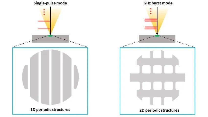 在對晶體硅的試驗中,GHz脈沖不僅能夠產(chǎn)生垂直于激光偏振的一維結構,即單脈沖模式下的激光所產(chǎn)生的那種結構,而且還能產(chǎn)生平行于偏振的其他周期結構,從而產(chǎn)生二維晶格圖案。