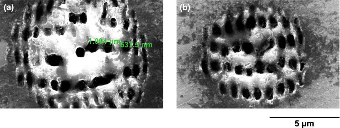 圖5顯示了一維LIPSS中納米溝槽電場增強的模擬結果。很明顯,增強并不是沿著納米溝槽恒定的(圖5(a))。周期性地獲得最高的電場,產(chǎn)生電場增強5倍以上的熱點。從圖5(b)可以看出,納米槽側壁頂部的電場最大,底部的電場也得到了較強的增強。因此,研究人員認為消融發(fā)生在納米槽的頂部和底部,從而產(chǎn)生了二維LIPSS。