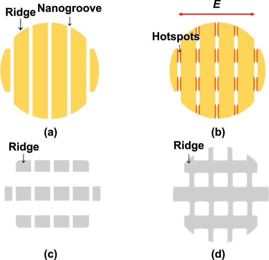 研究人員推測,二維LIPSS的形成歸因于局部表面等離子體共振(LSPR)在一維LIPSS的納米溝槽中產(chǎn)生的“熱點”。當光束照射在金、銀等金屬的一維LIPSS上時,由于LSPR的作用,在一維LIPSS的納米溝槽中產(chǎn)生了電場高度增強的熱點。當偏振方向垂直于一維LIPSS方向的光入射時,增強效果最大。如圖3(b)所示。在一維LIPSS中,納米槽的側壁周期性地產(chǎn)生熱點,并周期性地燒蝕側壁以生成二維LIPSS,如圖3(c)所示。