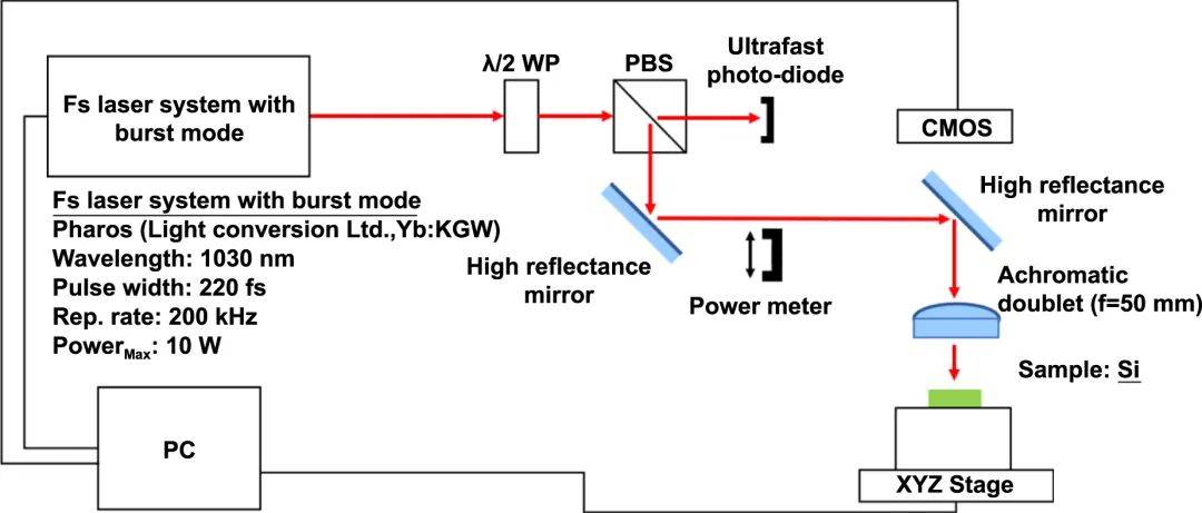 圖1:使用GHz飛秒激光脈沖形成LIPSS的實驗裝置示意圖。