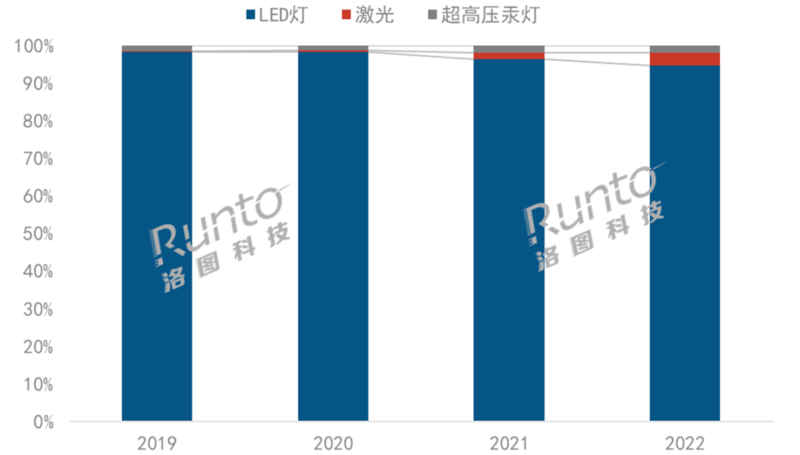 2019-2022年中國智能投影線上市場按銷量光源結構。數(shù)據(jù)來源:洛圖科技(RUNTO)線上數(shù)據(jù),單位:%
