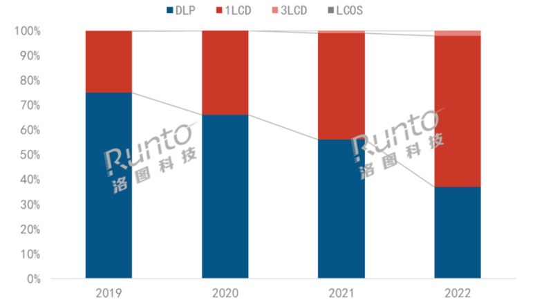 2019-2022年中國智能投影線上市場按銷量技術結構,數(shù)據(jù)來源:洛圖科技(RUNTO)線上數(shù)據(jù),單位:%