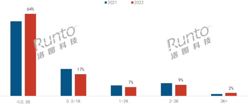 2021-2022年中國智能投影線上市場按銷量亮度結構。數(shù)據(jù)來源:洛圖科技(RUNTO)線上數(shù)據(jù),單位:%