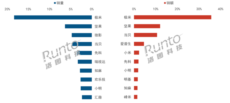 在銷額維度上,主流品牌則占據(jù)更多的市場份額。前四名極米、堅果、當貝、愛普生的合計份額(CR4)達到63.0%,市場集中度處于寡占型。TOP10品牌中,極米、堅果和當貝保持第三的位置,愛普生升至第四;知麻、峰米、小明的漲幅較高,超過100%。