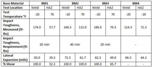 總的來(lái)說(shuō),沖擊韌性結(jié)果非常出色。所有焊接接頭(有沖擊韌性要求的)的沖擊韌性均遠(yuǎn)高于要求值。