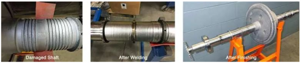 如圖6所示,第一根軸在密封件、探頭和軸頸區(qū)域受到廣泛的點(diǎn)蝕損壞。該圖還顯示了焊接后和最終機(jī)加工后修復(fù)后的軸。