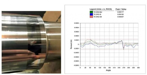 修復(fù)區(qū)域和軸的其余部分之間的顏色差異是由于拋光過(guò)程中基材的硬度差異造成的,但是,機(jī)械和電氣跳動(dòng)讀數(shù)在要求的公差范圍內(nèi)。