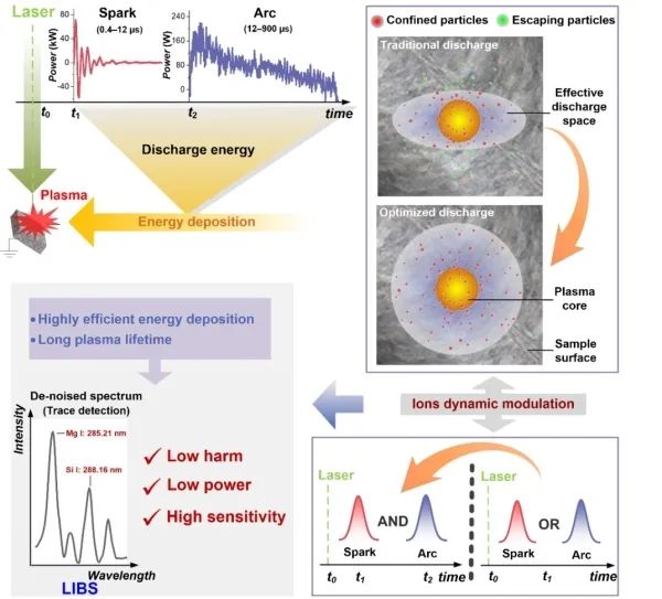 激光誘導(dǎo)擊穿光譜(LIBS)是基于原子發(fā)射光譜學(xué)的元素分析技術(shù),在多元素分析、實(shí)時快速原位測量等方面具備優(yōu)勢,且在定性識別物質(zhì)與定量物質(zhì)成分分析等領(lǐng)域具有重要的應(yīng)用前景。目前,該技術(shù)在深空深海探測、地質(zhì)勘探、生物醫(yī)藥以及環(huán)境監(jiān)測等領(lǐng)域廣泛應(yīng)用。D-LIBS即放電輔助LIBS技術(shù),通常是將火花放電或電弧放電與LIBS技術(shù)相結(jié)合來實(shí)現(xiàn)。以上兩種放電模式具有放電功率密度大和電子數(shù)密度高的特點(diǎn),在輔助元素定性和定量分析方面具有獨(dú)特的技術(shù)優(yōu)勢。因此,利用放電輔助可以顯著增強(qiáng)LIBS信號強(qiáng)度,從而達(dá)到提高分析靈敏度的目的。然而,D-LIBS在放電時電能消耗過大,同時從交變電壓和電流中產(chǎn)生電磁脈沖,導(dǎo)致能源浪費(fèi)和環(huán)境污染相關(guān)問題。這一負(fù)面因素加大了安全隱患和運(yùn)行風(fēng)險,更不利于社會倡導(dǎo)的節(jié)能減排和環(huán)境保護(hù)要求,進(jìn)而限制了D-LIBS技術(shù)的進(jìn)一步應(yīng)用。因此,開發(fā)一種“兩低一高”(低環(huán)境危害、低能耗、高分析靈敏度)的D-LIBS技術(shù)仍是物質(zhì)分析領(lǐng)域中難度較大的挑戰(zhàn)。