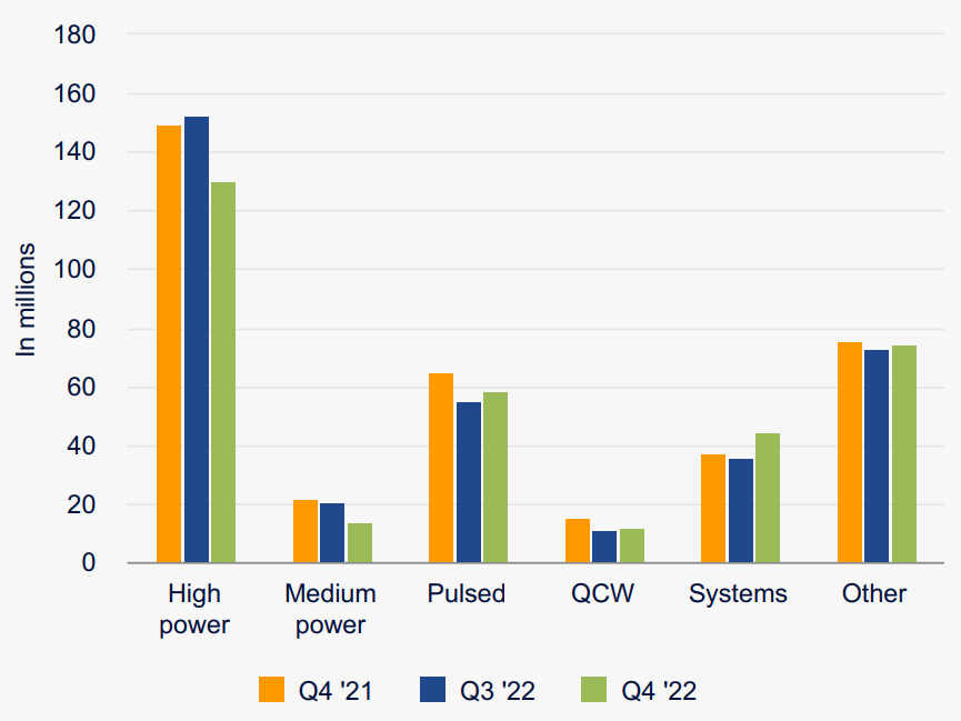 按產(chǎn)品種類劃分,由于大功率切割應(yīng)用需求下降,本季度IPG高功率連續(xù)波(CW)激光器的收入同比下降13%,部分被焊接業(yè)務(wù)的強(qiáng)勁增長(zhǎng)所抵消。脈沖激光器的銷售額同比下降9%,原因是切割和標(biāo)記應(yīng)用的需求下降,部分被太陽(yáng)能電池制造的增長(zhǎng)所抵消。