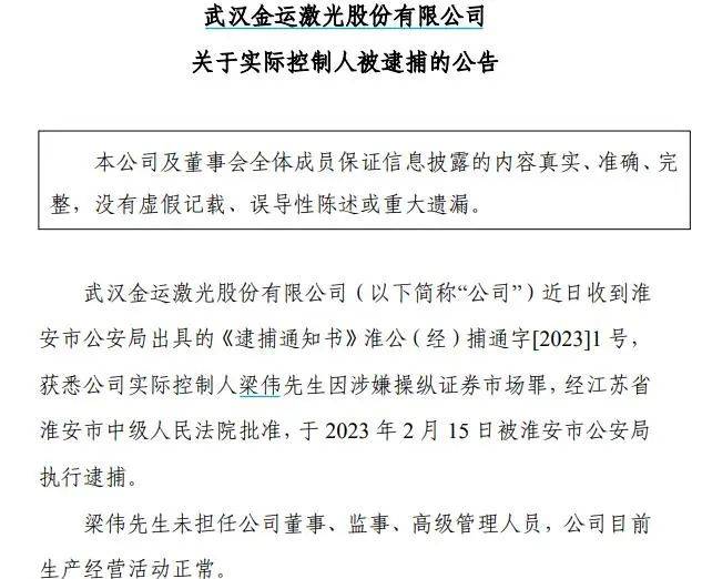 金運激光16日晚間公告披露,近日收到淮安市公安局出具的《逮捕通知書》淮公(經)捕通字[2023]1號,獲悉公司實際控制人梁偉先生因涉嫌操縱證券市場罪,經江蘇省淮安市中級人民法院批準,于2023年2月15日被淮安市公安局執(zhí)行逮捕。