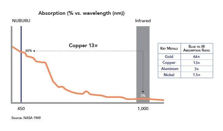 △銅、金、鋁和其他材料比其他波長(zhǎng)的激光更好地吸收藍(lán)色激光。圖片來(lái)自NUBURU/NASA 1969
