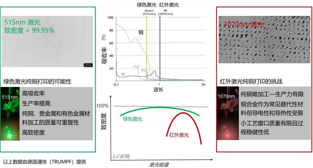 2017年,德國(guó)弗勞恩霍夫激光技術(shù)研究所的研究人員率先在綠色激光打印純銅方面做出探索,他們開(kāi)發(fā)一種綠色激光選區(qū)激光熔化(SLM)系統(tǒng),用于純銅或銅合金的3D打印,該技術(shù)被命名為“綠色SLM”。