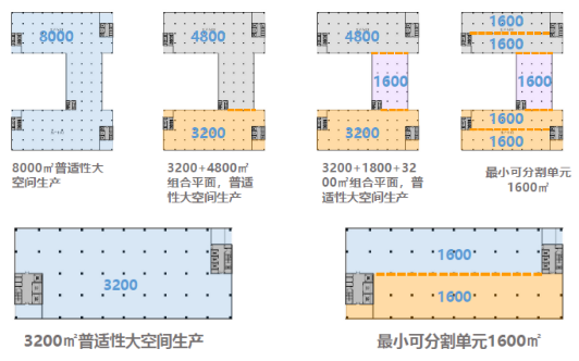 一是層面布局按照“可拆可合”要求,設(shè)計出“C字型”“一字型”兩種廠房結(jié)構(gòu),盡可能保障流水線長度。其中,C字形標準層面積達8000㎡,一字形標準層分別為3000㎡、5500㎡、8000㎡。各類廠房可靈活分拆成1600-8000㎡不等單元,保證了不同業(yè)態(tài)企業(yè)的生產(chǎn)需求。