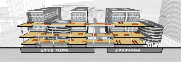 四是采用了盤道和高架平臺,裝卸貨可直通各樓層。借鑒裕廊“趨勢工廠”經(jīng)驗,通過盤道連接各個樓層。每棟建筑由3個三層單元堆疊,2、5、9層架設(shè)高架平臺,功能效果與首層相似。第9層平臺有吊裝重型設(shè)備的預(yù)留位置。同時2、5、9層預(yù)留有卸貨平臺及貨車停車位。貨車經(jīng)盤道到達對應(yīng)樓層平臺卸貨搬運,可大大縮減貨運時間。