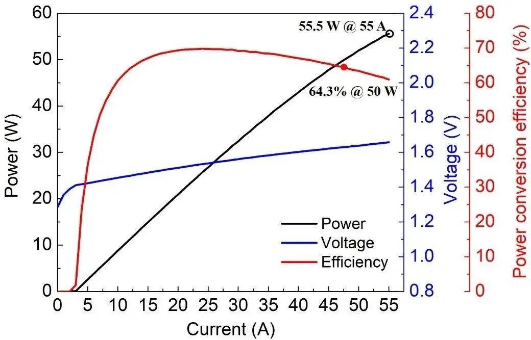 高功率、高效率、高亮度是激光技術(shù)和應(yīng)用孜孜以求的目標,也是當前激光技術(shù)領(lǐng)域中比較活躍的研究領(lǐng)域。我們通過對基礎(chǔ)物理、材料科學(xué)以及器件制備工藝的深入研究,優(yōu)化了芯片的內(nèi)量子效率、腔內(nèi)光學(xué)損耗以及腔面的高負載能力,成功實現(xiàn)了輸出功率和電光轉(zhuǎn)換效率的顯著提高。開發(fā)的915nm單管激光芯片,在室溫和55A連續(xù)工作條件下,突破性的實現(xiàn)了55.5W的高輸出功率,而且具有高的電光轉(zhuǎn)換效率、小的水平發(fā)散角和高的偏振度。