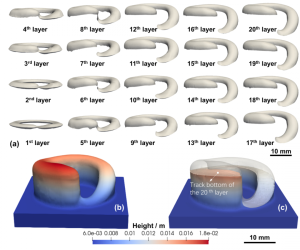 該研究揭示了激光增材制造過程中熔池內(nèi)部作用力對沉積偏差的影響機制,在介觀尺度探明了蒸汽反沖壓力、表面張力、熱毛細力在不同傳熱條件下對熔池形態(tài)的具體作用,繼而闡明了封閉路徑結(jié)構(gòu)在掃描路徑處產(chǎn)生偏差的根本原因。