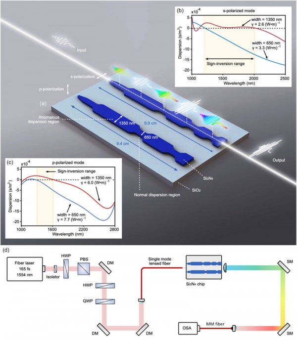荷蘭特溫特大學的研究團隊提出了一種方案,其中集成超連續(xù)譜生成的輸入能量需求大幅降低了幾個數量級,帶寬生成的數量級為500–1000nm。通過在CMOS兼容的氮化硅波導中的符號交替色散,效率提高了2800倍。