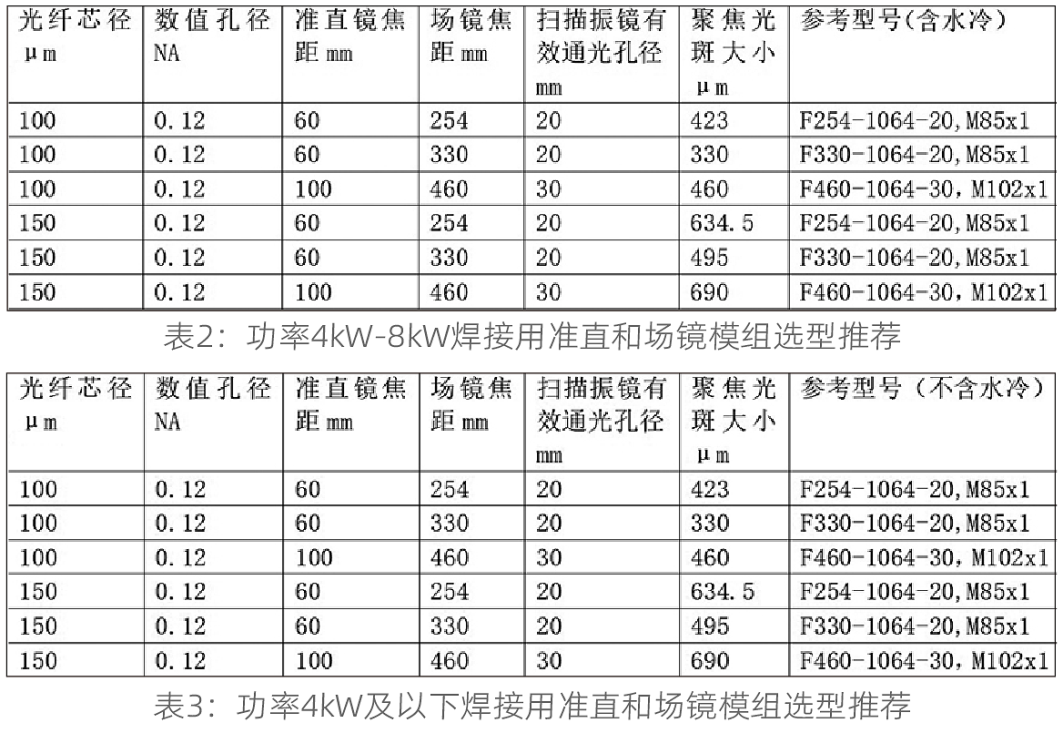 焊接用激光器的纖芯直徑一般100~600um,對應的數(shù)值孔徑一般在0.1~0.22不等。在確定激光器數(shù)據(jù)后,我們一般要根據(jù)掃描振鏡的有效口徑反過來計算準直透鏡的焦距。例如: 掃描振鏡的有效孔徑是30mm,那么輸入到振鏡的光束就不能大于30mm,實際的經(jīng)驗是選擇準直后的光束在20~25mm之間,即為振鏡有效孔徑的2/3~4/5.假設光纖的數(shù)值孔徑NA= 0.12, 準直后的光斑為D,準直鏡頭組的復合焦距為f,根據(jù)公式D=2*f*NA.當20≤D≤25時,83≤f≤104,可以選擇f100的準直組件,即可滿足需求。進一步可以根據(jù)激光器的芯徑大小和實際需要的聚焦光斑,來選擇合適的掃描場鏡。例如,激光纖芯直徑為200um,根據(jù)光學聚焦公式:d≈dfiber*ff/fc,其中ff為掃描場鏡等效焦距,fc為準直鏡組焦距。如果希望的聚焦光斑d=600um,則ff≈600um*100mm/200um≈300mm,那么可以選擇等效焦距ff≈330的標準場鏡。下表(表2和表3)為常見的焊接用準直和場鏡模組的選型推薦:功率4kw以上~8kw。
