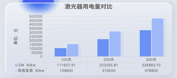 與其他友商應(yīng)用915nm技術(shù)的激光器相比應(yīng)用976nm技術(shù)的光惠激光40kw激光器一年可為客戶節(jié)省超10w元的電費(fèi)成本。以一臺激光器一年工作300天,每天工作12個(gè)小時(shí)、電費(fèi)1元/度來算,光惠激光40kw激光器一年可節(jié)省電費(fèi)143916元。