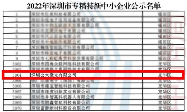 公大激光成功入選2022年度深圳“專精特新”企業(yè)名單