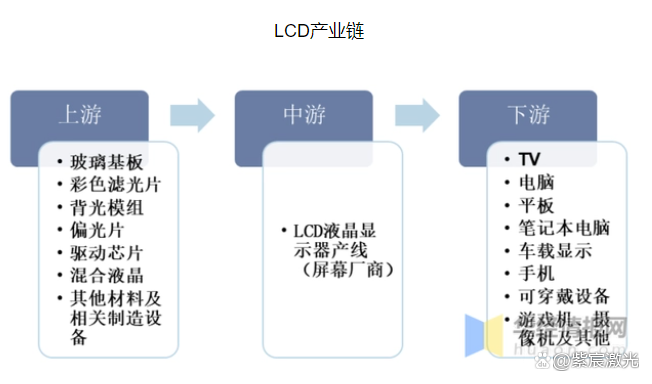 LCD面板產(chǎn)業(yè)可以分為上游基礎(chǔ)材料、中游面板制造以及下游終端產(chǎn)品。其中,上游基礎(chǔ)材料包括:玻璃基板、濾光片、偏光片、液晶、驅(qū)動芯片等;中游是LCD液晶顯示器產(chǎn)線;下游終端產(chǎn)品包括:電視、電腦、手機(jī)和其他消費(fèi)類電子。