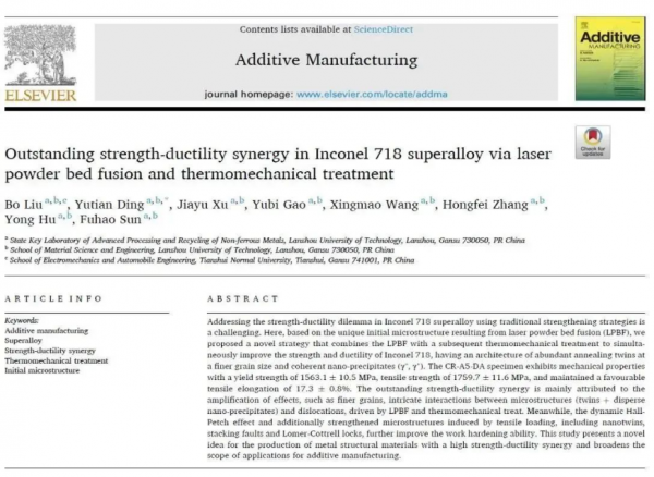 近日,省部共建有色金屬先進加工與再利用國家重點實驗室丁雨田教授科研團隊在激光增材制造鎳基高溫合金的孿晶界面調(diào)控研究中取得重要進展,研究成果以“Outstanding strength-ductility synergy in Inconel 718 superalloy via laser powder bed fusion and thermomechanical treatment”為題發(fā)表在國際工程技術(shù)領(lǐng)域TOP期刊《Additive Manufacturing》(IF:11.632/Q1)上。蘭州理工大學(xué)省部共建有色金屬先進加工與再利用國家重點實驗室為第一完成單位,合作單位為天水師范學(xué)院機電與汽車工程學(xué)院和鎳鈷資源綜合利用國家重點實驗室;劉博博士為第一作者,丁雨田教授為通訊作者。