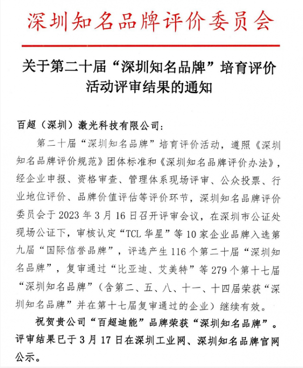 3月16日,第二十屆“深圳知名品牌”通過(guò)長(zhǎng)達(dá)半年的評(píng)審,終于塵埃落定,瑞士百超集團(tuán)全資子公司:百超(深圳)激光科技有限公司憑借強(qiáng)大的品牌影響力、亮眼的市場(chǎng)表現(xiàn)、突出的自主創(chuàng)新能力等優(yōu)勢(shì),成功入選“深圳知名品牌”。