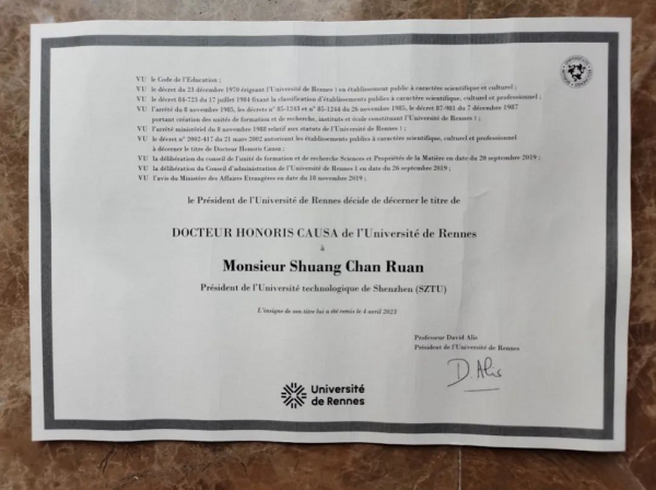 深技大校長(zhǎng)阮雙琛教授獲頒法國雷恩大學(xué)榮譽(yù)博士稱號(hào)