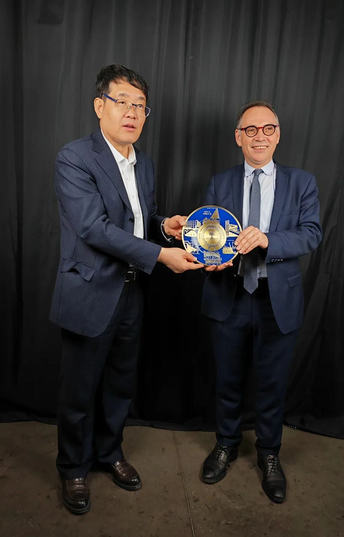 ▲ 阮雙琛向雷恩大學(xué)贈(zèng)送深技大紀(jì)念校盤