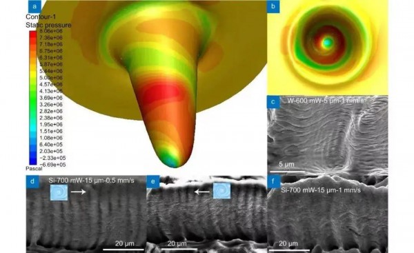 新型加工工藝加的壓強可達到MPa級,圖2a-b所示為仿真獲得的漩渦靜態(tài)壓強側視圖和俯視圖。超高的壓強作用于側壁會導致平行溝槽碎裂(圖1a),還會導致脆性金屬鎢側壁沿水平方向碎裂(圖2c),在垂直方向留下漩渦的刻蝕痕跡(圖2c)。700 mW功率飛秒激光加工硅的結構側壁也發(fā)現(xiàn)了漩渦刻蝕的溝槽(圖2d-f),側壁溝槽結構在頂部和底部有明顯的偏移(圖2d),表明漩渦不是靜態(tài)的,而是動態(tài)移動的。