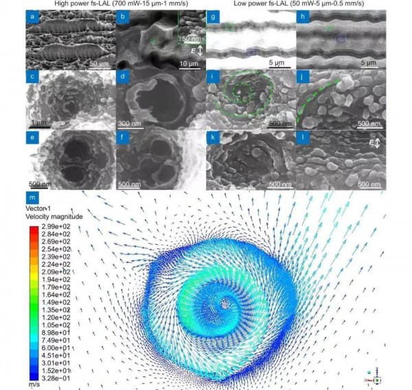 將傳統(tǒng)的飛秒激光液相加工、飛秒激光液相沖擊和碎裂工藝相結合,本團隊首次實現(xiàn)了基于飛秒激光液相沖擊碎裂微納加工易碎硅材料【Int. J. Extrem. Manuf. 2020, 2, 045001】。在激光功率為700 mW超強沖擊波作用下,平行溝槽碎裂生成如圖1a所示結構,只有部分溝槽沒有被破壞。溝槽上有典型的垂直于激光偏振方向的高頻周期LIPSS結構,周期在100-200 nm之間(圖1b);在溝槽底部的孔洞呈現(xiàn)如圖1c-f所示的圓形和雙圓形LIPSS結構,是由流體的漩渦和渦流屏蔽(雙漩渦)效應導致的。在小功率(50 mW)情況下,沖擊波能量比較小,平行溝槽未被破壞;溝槽底部有一系列孔洞(圖1g-h),部分呈現(xiàn)漩渦所致螺旋狀結構(圖1i)。在溝槽的邊緣發(fā)現(xiàn)了弧狀結構(圖1j),展現(xiàn)漩渦長度從溝槽的上部一直到達其底部,影響所有其覆蓋LIPSS的發(fā)展方向。此外,漩渦還會誘導LIPSS方向傾斜(圖1k),使其不再垂直于激光極化方向。僅在溝槽結構的頂部,存在垂直于激光極化方向的LIPSS結構(圖1l)。在量綱分析的基礎上,對單孔洞在垂直和水平交疊的高速流體作用下的微納流動、沖擊行為進行了仿真,驗證漩渦的生成(圖1m)。
