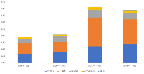 維宏股份——目前收入構(gòu)成中,一體機(jī)、控制器、驅(qū)動(dòng)器、配件及其他、其他,分別占比47.76%、35.14%、12.51%、4.41%、0.18%。其中,一體機(jī)集成了運(yùn)動(dòng)控制卡、 CPU 主板、顯示器(液晶屏)、專業(yè)操作面板等;控制器是數(shù)控軟件的底層控制算法的載體以及硬件接口。