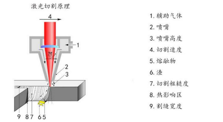 (一)激光切割的基本原理,簡(jiǎn)單來說,就是用激光束將材料局部加熱至超過熔點(diǎn),然后用高壓氣體或蒸汽,將熔融的金屬吹離,從而形成一個(gè)非常窄的切口,并隨著激光束與材料相對(duì)移動(dòng),依次切割形成孔洞。