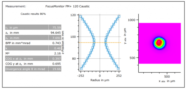光束質(zhì)量M2,反映了光束在光學(xué)系統(tǒng)中的聚焦程度及傳輸過程中的合焦程度。M2越小,光束聚焦度越高,能量密度越大,光束質(zhì)量越好。