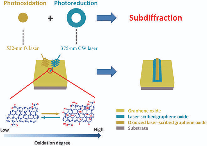 石墨烯的激光直寫圖案化被廣泛應用于光電子器件領域,可以有效提升器件的性能。傳統(tǒng)的石墨烯圖案直寫通常利用單光束光刻驅(qū)動氧化石墨烯的光還原,從而形成石墨烯圖案。但由于光學衍射極限的限制,目前所報道的激光直寫石墨烯圖案的線寬大都在微米量級,制作超越衍射極限尺度的激光直寫石墨烯圖案是光刻領域的一個巨大的挑戰(zhàn)。