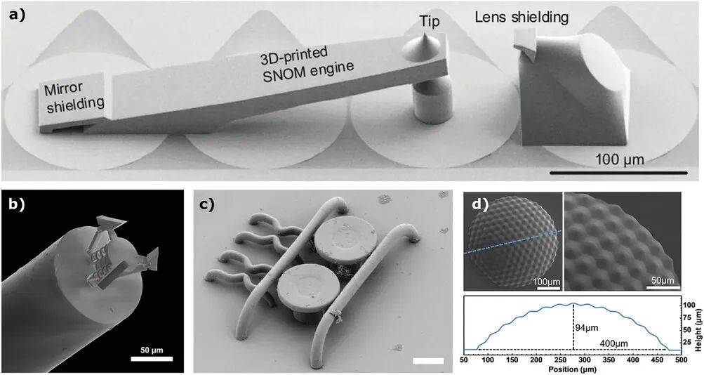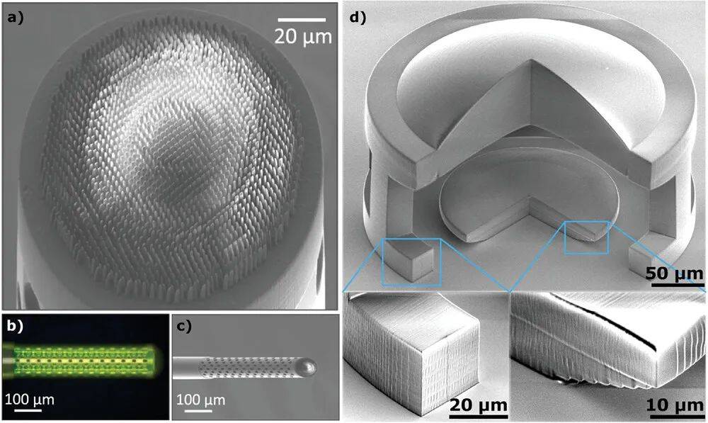 圖5:MPL技術實現了復雜的設計能力。a)掃描探針顯微鏡引擎的SEM圖像。來自威利vch。b)夾頭光纖的SEM圖像。來自John Wiley and Sons。c)微諧振器、波導和耦合器的三維量子光學組件的SEM圖像。來自自然出版社;d)所制備的對數圖像的形貌,上面的圖像是整體的和放大的SEM圖像,下面的結果是相對的截面輪廓。來自施普林格·自然。所有結構都將受益于HTA,因為它們分別增加了光學透明度和機械剛性(a),穩(wěn)定性和耐久性(b),精確排列(c),材料均質化(d)。