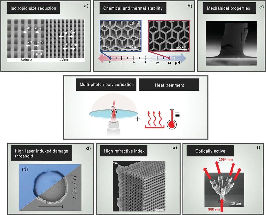 傳統(tǒng)用于多光子光刻的材料是純有機材料和雜化材料;這類材料提供了很大的靈活性,然而,它們也有一些局限性:光聚合物通常具有低折射率(RI)和柔軟(低楊氏模量)。此外,聚合物更容易受到熱和化學損傷。煅燒和熱解作為后處理的發(fā)展為解決這些問題提供了機會,并開發(fā)出比有機或混合結構性能更好的無機結構(圖3)。