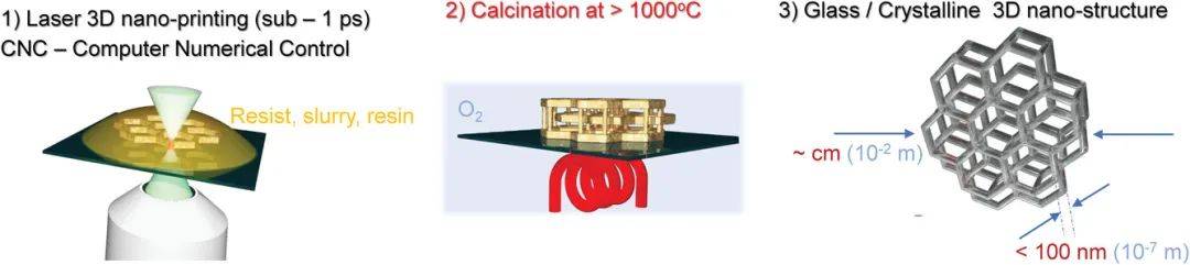 圖1:通過計算機數控(CNC)進行3D打印的概念:通過在氧氣中受控的高溫退火,從聚合物到玻璃陶瓷。最終工件的特征尺寸可以達到納米級≈100納米,宏觀尺寸為≈cm,因此是中尺度的3D結構/打印。