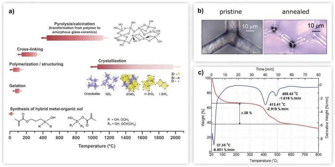 圖2:a) Si-Zr有機金屬體系從合成到結晶的熱轉變步驟。來自作者G. Merkininkait;b) 3D微支架在1400°C大氣中煅燒前后的光學圖像。來自英國皇家化學學會。c)熱重分析(TGA)數據顯示失重隨溫度的變化。來自MDPI