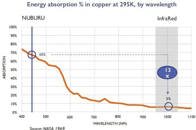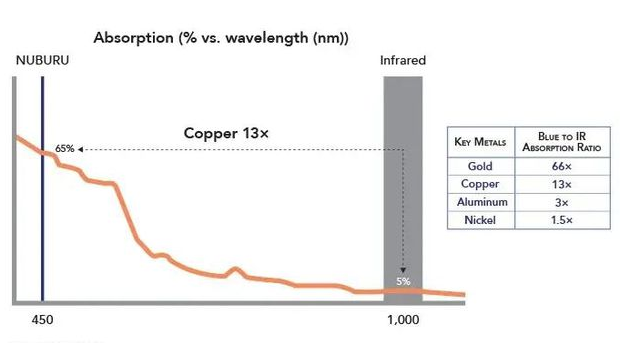 銅是一種重要的經(jīng)濟(jì)材料,它不適合用傳統(tǒng)的紅外工業(yè)激光(通常約為 1 μm)進(jìn)行加工。藍(lán)色的好處源于基礎(chǔ)物理學(xué)。如下圖所示,銅在紅外波長下僅吸收約百分之五的入射功率。