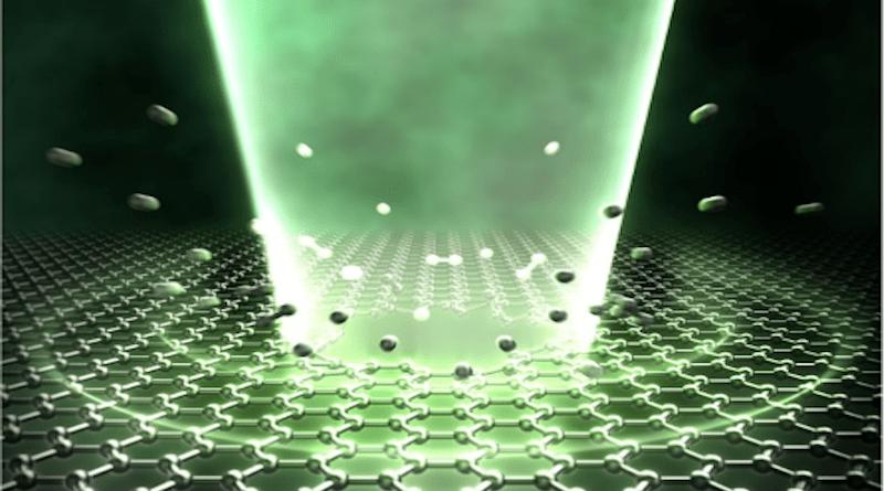 通過(guò)激光照射對(duì)石墨烯薄膜進(jìn)行鉆孔的圖示。碳原子的大小被夸大了,與實(shí)際大小不同。