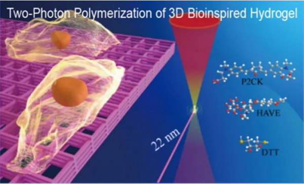 作者采用飛秒激光雙光子聚合技術(shù),以乙烯基酯透明質(zhì)酸(HAVE)水凝膠作為單體材料,P2CK作為高效水溶性雙光子引發(fā)劑,二硫蘇糖醇(DTT)作為硫醇-烯點擊化學(xué)交聯(lián)劑和PBS緩沖溶液配制了HAVE前驅(qū)體,通過配方優(yōu)化和激光焦點調(diào)控在水凝膠結(jié)構(gòu)分辨率上取得了重要突破,最高分辨率達到22 nm,制備了與細胞尺寸相當?shù)乃z3D微支架并驗證了材料與結(jié)構(gòu)的生物相容性,表明HAVE水凝膠細胞支架可以進一步用于研究細胞遷移和操作等行為。