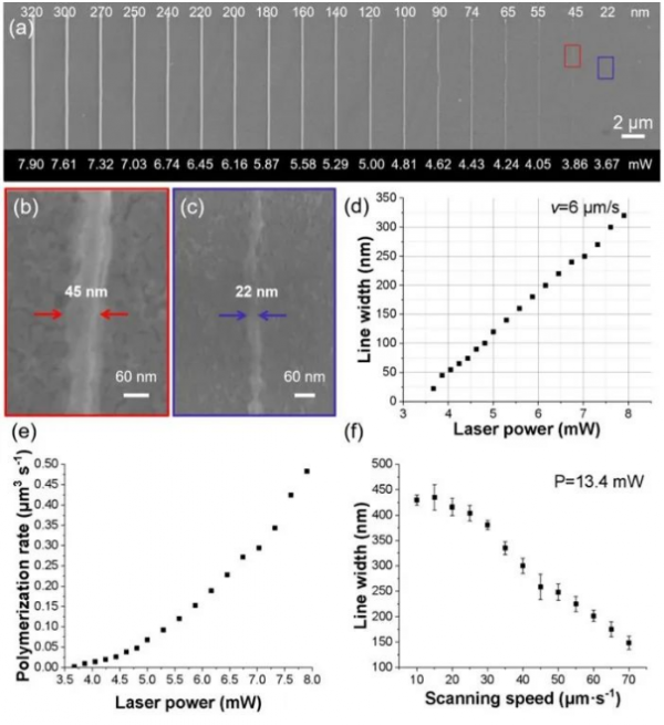 通過上述配方優(yōu)化和焦點調(diào)控,開展了HAVE前驅(qū)體C配方的分辨率研究。當掃描速度為6 μm/s時,線結(jié)構(gòu)的質(zhì)量得到了顯著的提高(圖3a),其線結(jié)構(gòu)是完整的、致密的,利用HAVE前驅(qū)體C配方實現(xiàn)了22 nm的分辨率(圖3c)。